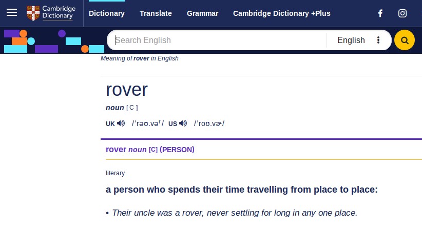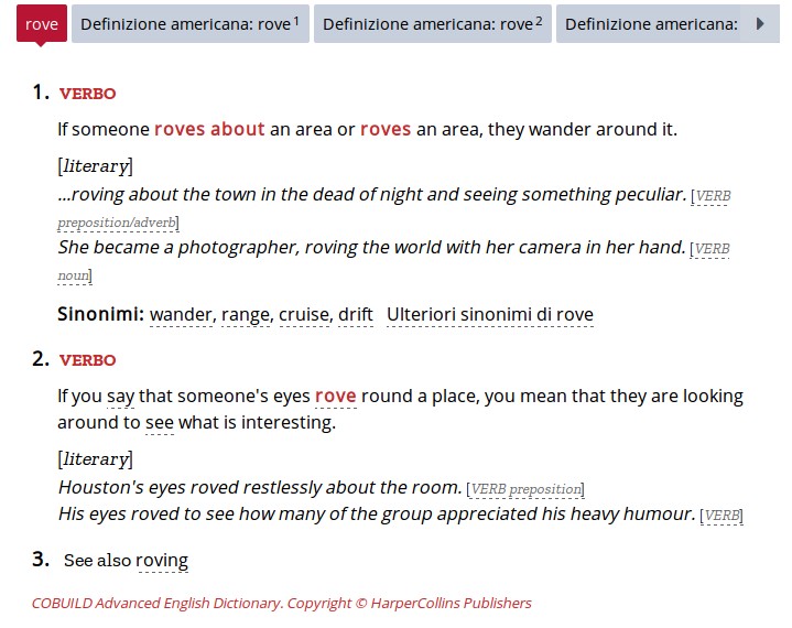 Se qualcuno, someone, roves, il verbo ci avverte che questa persona sta compiendo un’azione di esplorazione. Passo il mio tempo qua e là; mi trovo in uno attenzione attiva, vago e guardandomi intorno cerco qualcosa di interessante.